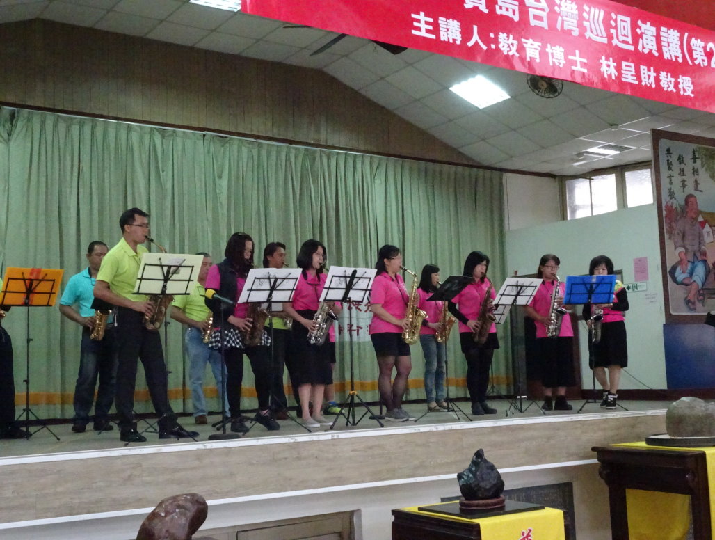活動一開始是由本鎮鎮公所培訓組成的熱情潮州森巴鼓隊。熱情潮州森巴鼓隊成立至今已3年多,係由一群熱愛打鼓的鎮民組成,平均年齡約50-60歲,但其熱情度絲毫不輸年輕人,今天有15人上台表演,用熱情的鼓聲來歡迎今天的來賓。接著是潮州鎮民薩克斯風樂團上台表演,該團已成立一周年,經常到老人院及社區做公益表演,今天有20人上台表演大家都很熟悉的鄉土民謠。 |